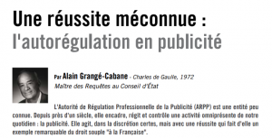 A lire dans le chapitre « un mode de régulation sectoriel institutionnalisé », pages 48-51, l’entretien d’Alain Grangé-Cabane (Charles de Gaulle, 1972), Maître des Requêtes au Conseil d’État, Réviseur de la Déontologie Publicitaire, paru dans le numéro daté mars 2021 de la Revue des anciens élèves de l’ENA – Hors les murs, consacrée au droit souple.