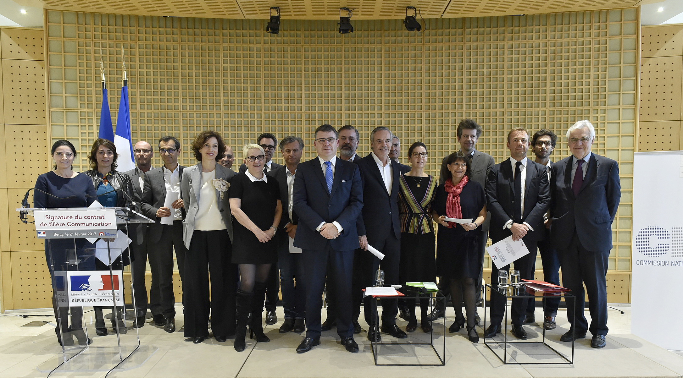 Le contrat de filière a été présenté par Madame Mercedes ERRA, préfiguratrice du comité de filière « La communication », à Madame Audrey AZOULAY, Ministre de la culture et de la communication et à Monsieur Christophe SIRUGUE, Secrétaire d’Etat chargé de l’industrie, lors de la cérémonie de signature du 21 février 2017.