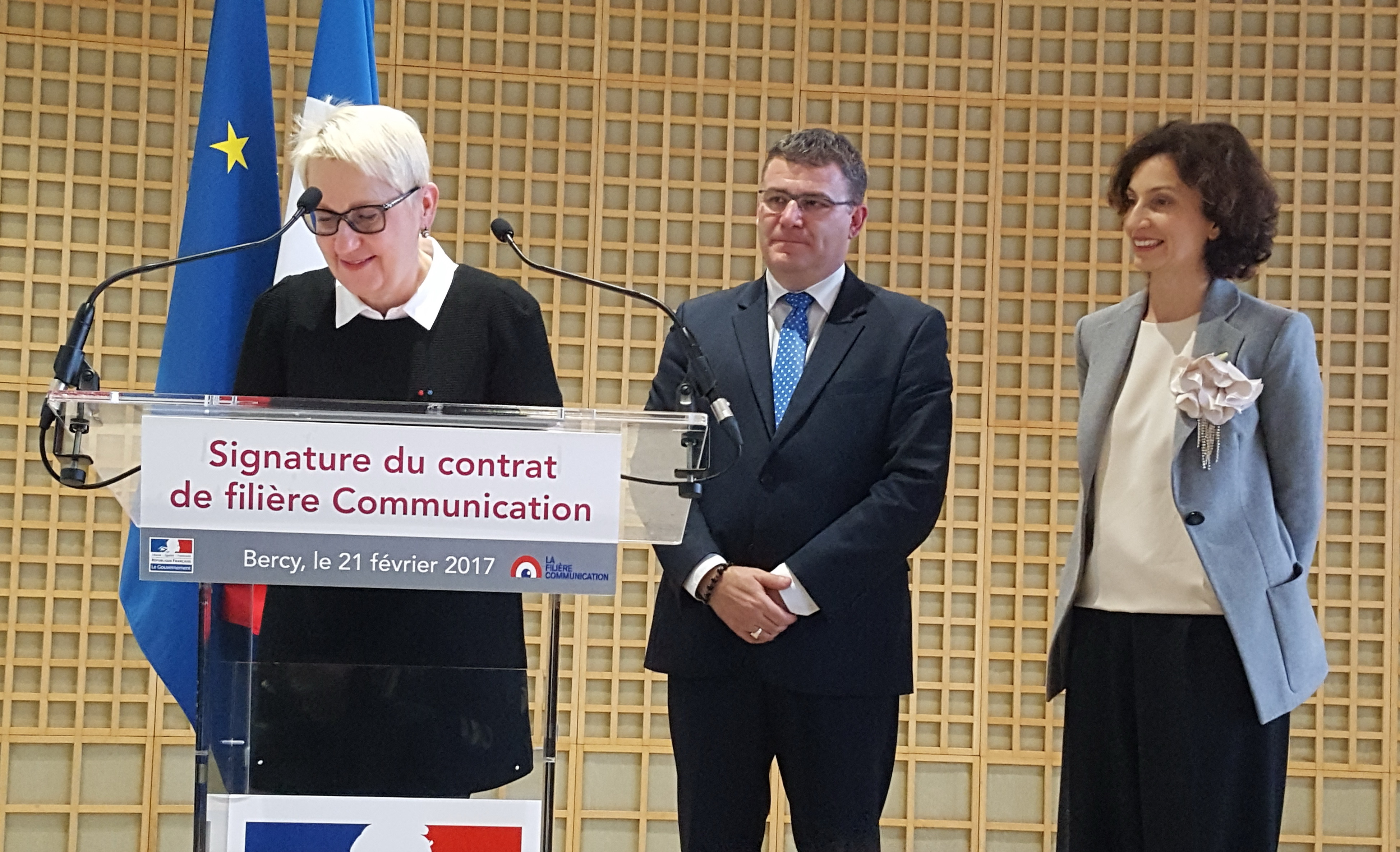 Le contrat de filière a été présenté par Madame Mercedes ERRA, préfiguratrice du comité de filière « La communication », à Madame Audrey AZOULAY, Ministre de la culture et de la communication et à Monsieur Christophe SIRUGUE, Secrétaire d’Etat chargé de l’industrie, lors de la cérémonie de signature du 21 février 2017.