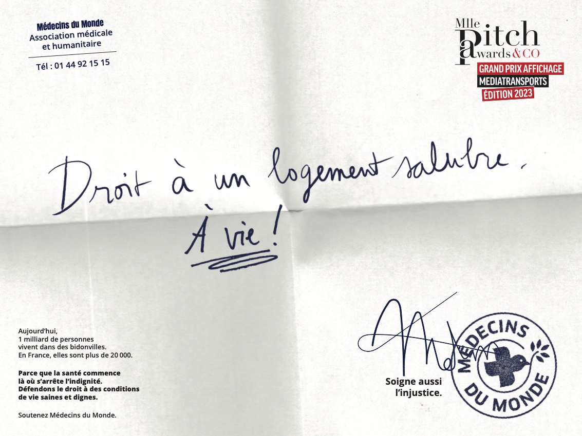 Pour rappel, l’édition 2023 pour MEDECINS DU MONDE a élu la campagne d’affichage « L’ORDONNANCE HUMANITAIRE », GRAND PRIX AFFICHAGE MEDIATRANSPORTS.
