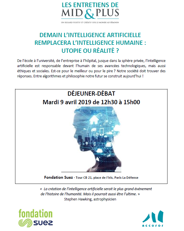 09.04.2019 – Intervention de Stéphane Martin, Directeur Général de l’ARPP, sur le sujet « Ethique et Robots » au déjeuner-débat : « Demain l’intelligence artificielle remplacera l’intelligence humaine : utopie ou réalité ? » ARPP il y a 9 ans https://midetplus.fr/ midetplus@gmail.com https://youtu.be/DlOXpmROxtU Paris, le 8 avril 2019