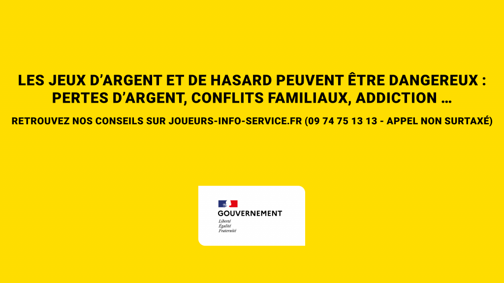 « Les jeux d’argent et de hasard peuvent être dangereux : pertes d’argent, conflits familiaux, addiction … Retrouvez nos conseils sur joueurs-info-service.fr et au 09 74 75 13 13, appel non surtaxé. »