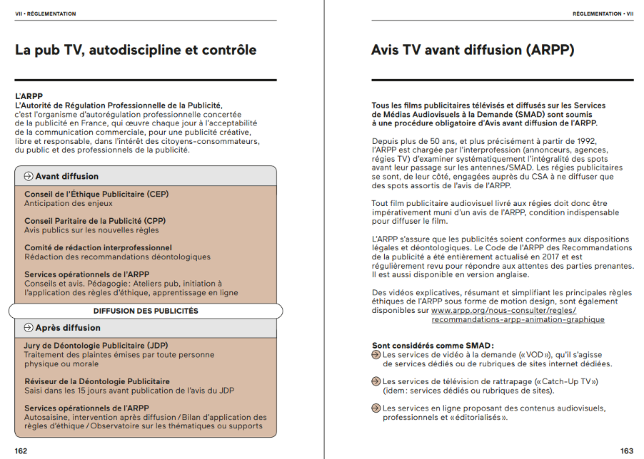 Dans la dernière partie, « Réglementation », en pages 161 et suivantes, vous retrouverez tout ce qu’il est utile de savoir sur la publicité TV, l’autodiscipline ou le contrôle avant diffusion effectué par l’ARPP !