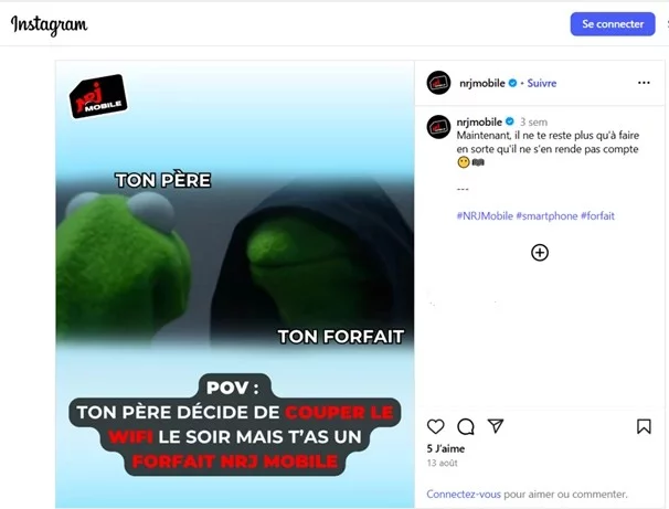 Diffusée sous la forme d’une publication sur les réseaux sociaux, la publicité en cause montre deux marionnettes qui se font face, désignées l’une comme « TON PERE », l’autre comme « TON FORFAIT », ainsi que les textes : « Pov : ton père décide de couper le wifi le soir mais t’as un forfait NRJ Mobile » et « Maintenant, il ne te reste plus qu’à faire en sorte qu’il ne s’en rende pas compte ».